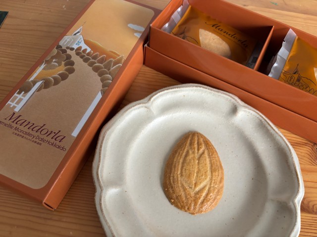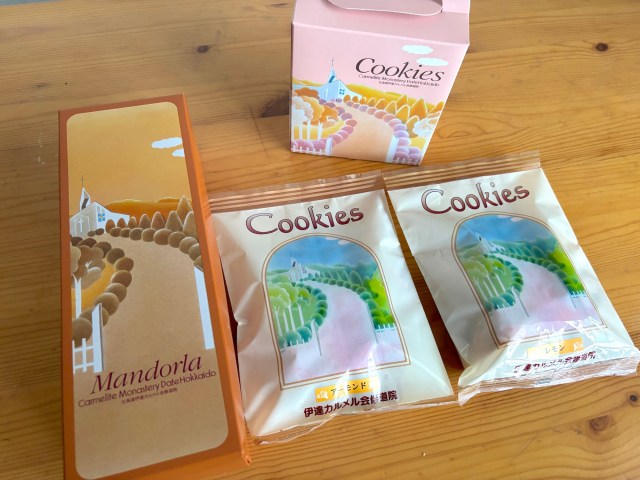 ▼(2025年8月7日追加)北海道・伊達カルメル会修道院の「マンドルラ」。アーモンドが入ったサクッとしたサブレ。夕焼けの散歩道が描かれたパッケージも含めて郷愁をさそいます