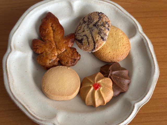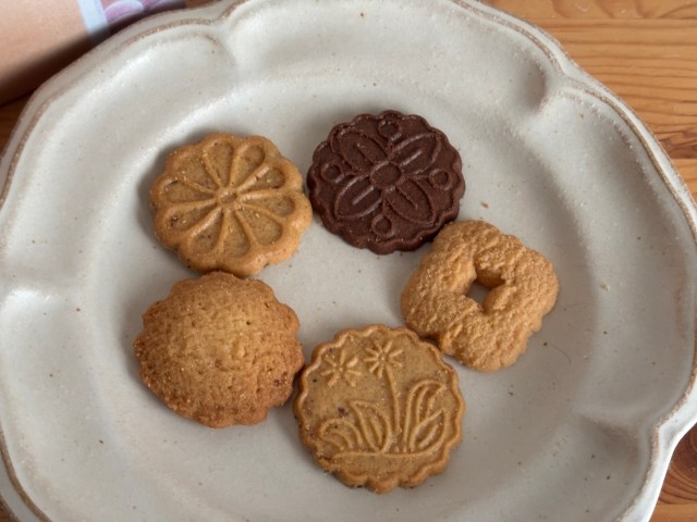 素朴な型抜きクッキーが12種類詰め合わせになっている。お花型やチョコとバニラのボックスクッキーなど意外なほど種類が豊富。味も少しずつ違う。