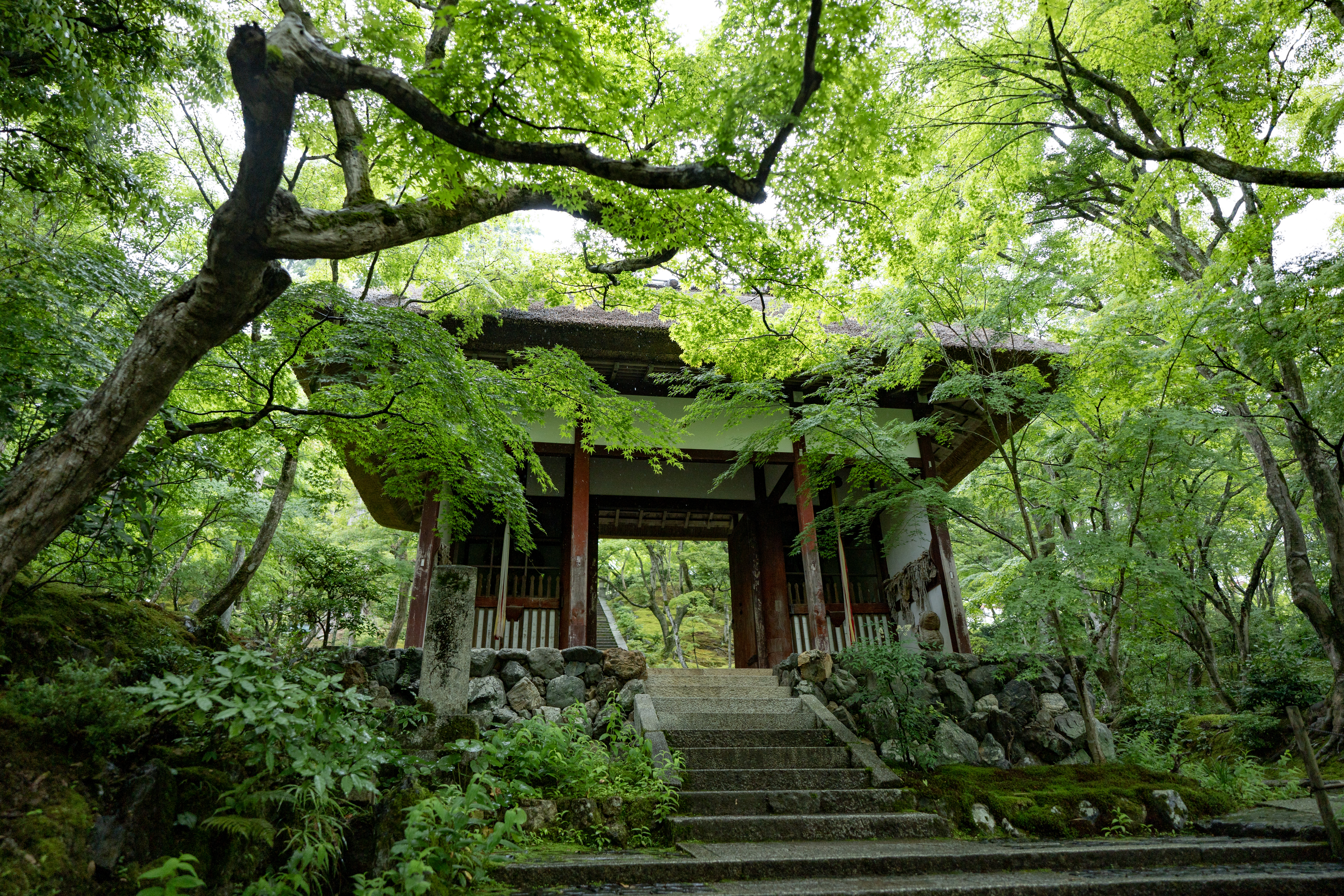 常寂光寺と言えば秋の見事な紅葉がとくに有名だ。今の時期のカエデは青々と生い茂り、空をも覆いつくさんという勢い。今日は雨なのもあって特に瑞々しく、全てが緑がかって見える。